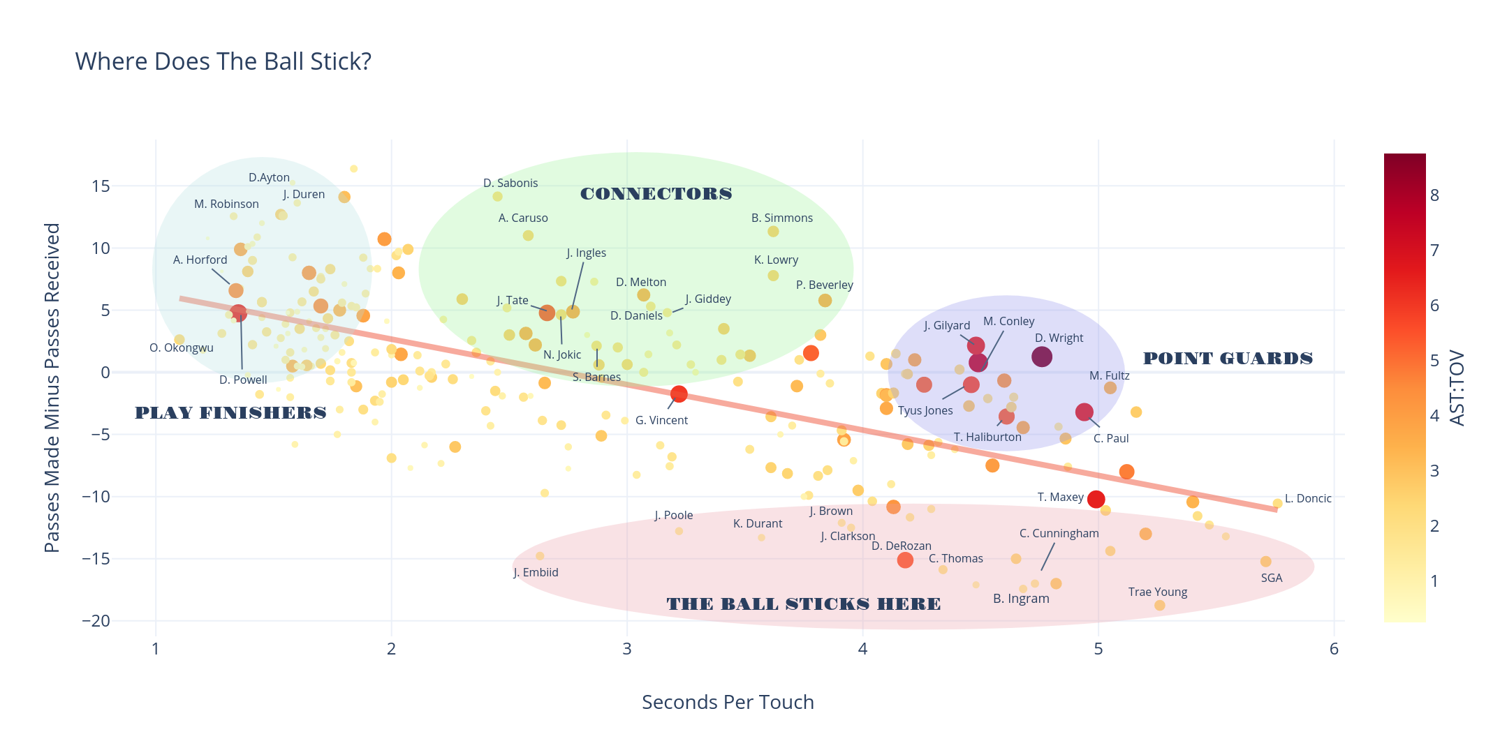 Ingram, on average, receives 57 passes a game. He returns the favor to his teammates only 39 times. This differential is second worst in the league amongst players who have played at least 100 minutes this season, and it is not a new story for him. Ingram has routinely found himself among the league’s most ball dominant players. He averages 4.68 seconds per touch, which is far beyond any other player on the Pelicans’ roster. For reference, Zion is at 3.14 seconds per touch