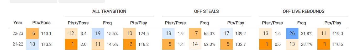 Now some of the Pelicans slippage last year can be attributed to the mass of injuries. With Zion out for the majority of the season, the team lost not only one of the most dynamic offensive rebounders in the game, but their best offensive player. As the offense took a tailspin, the number of missed shots and turnovers increased - allowing teams to enjoy a larger amount of time in transition.
